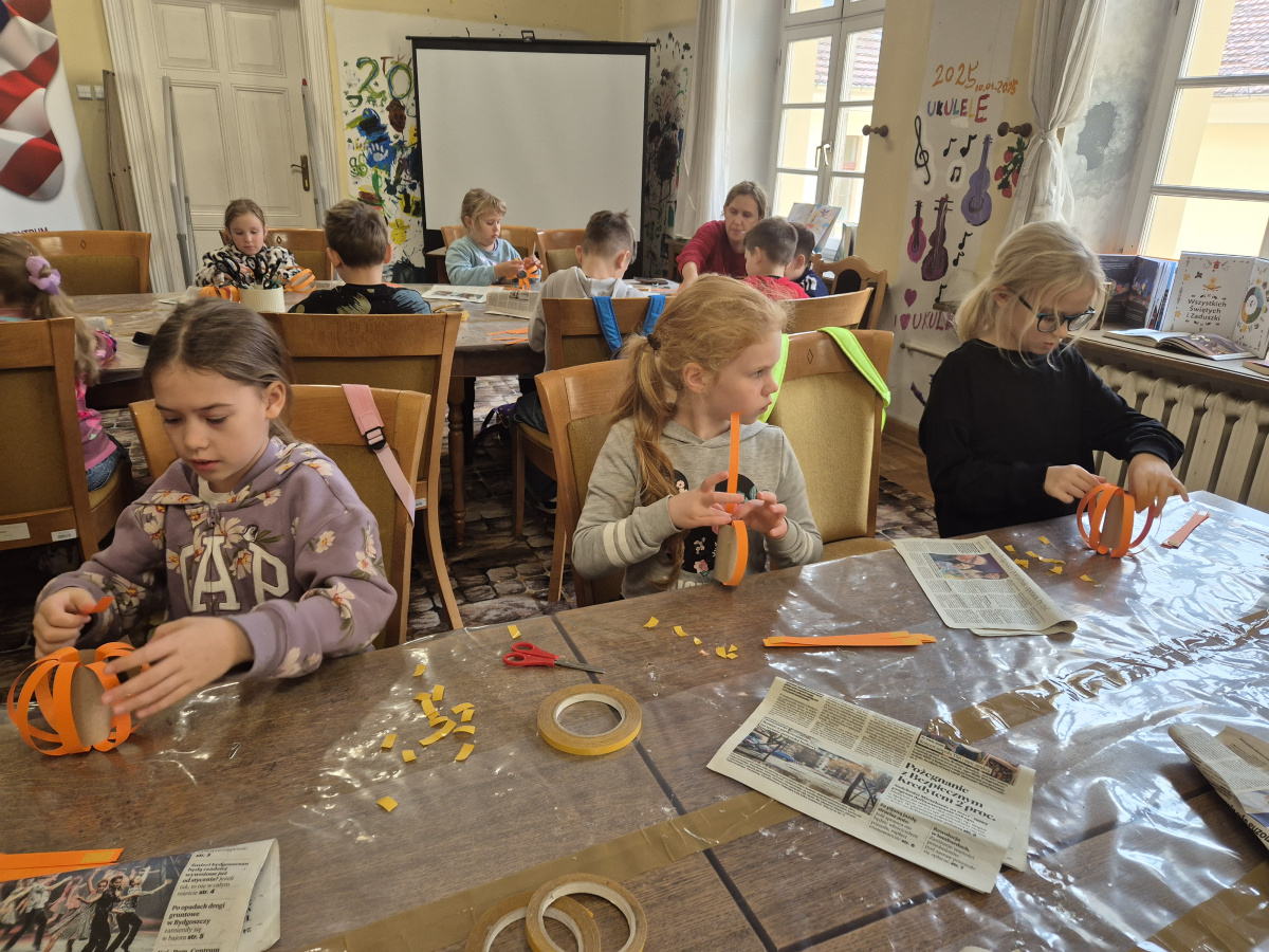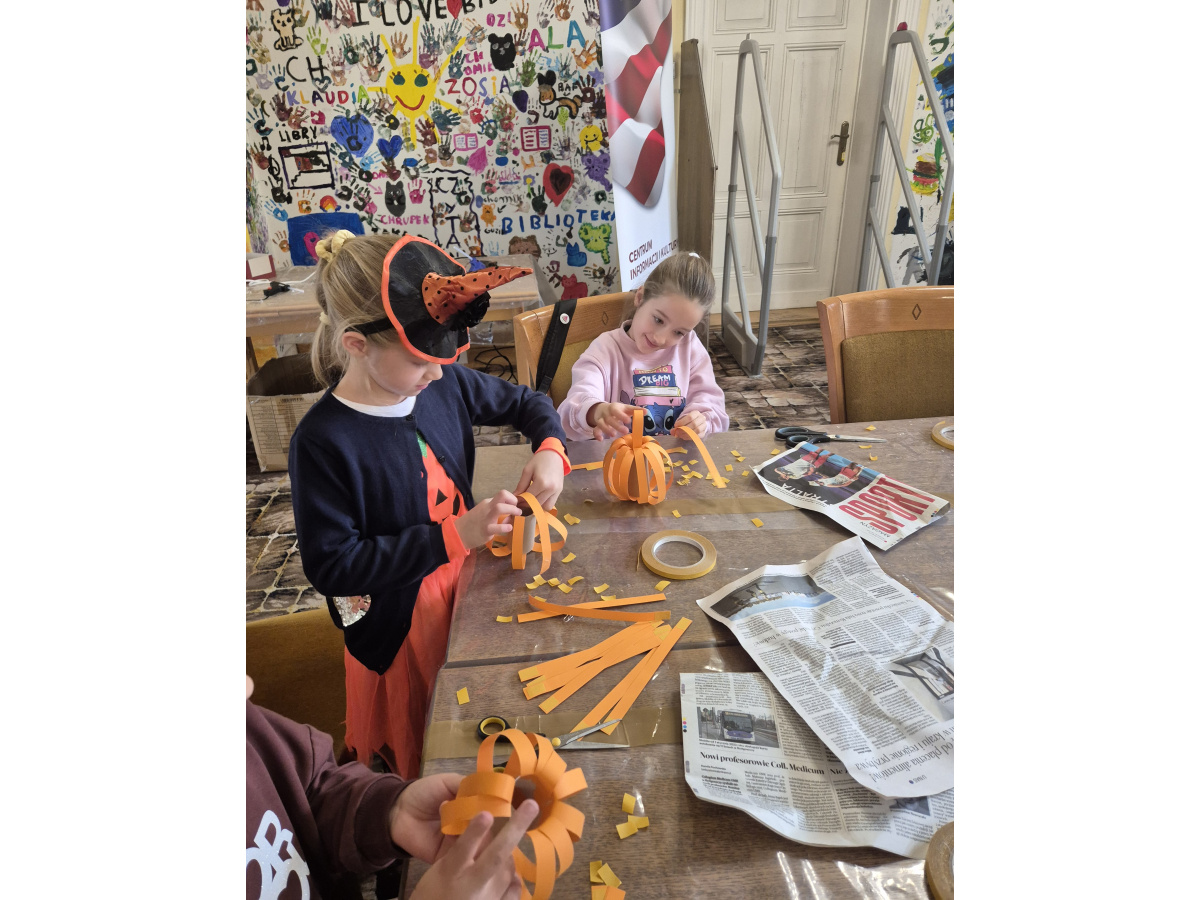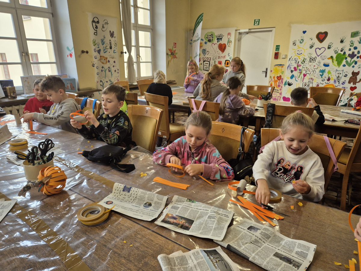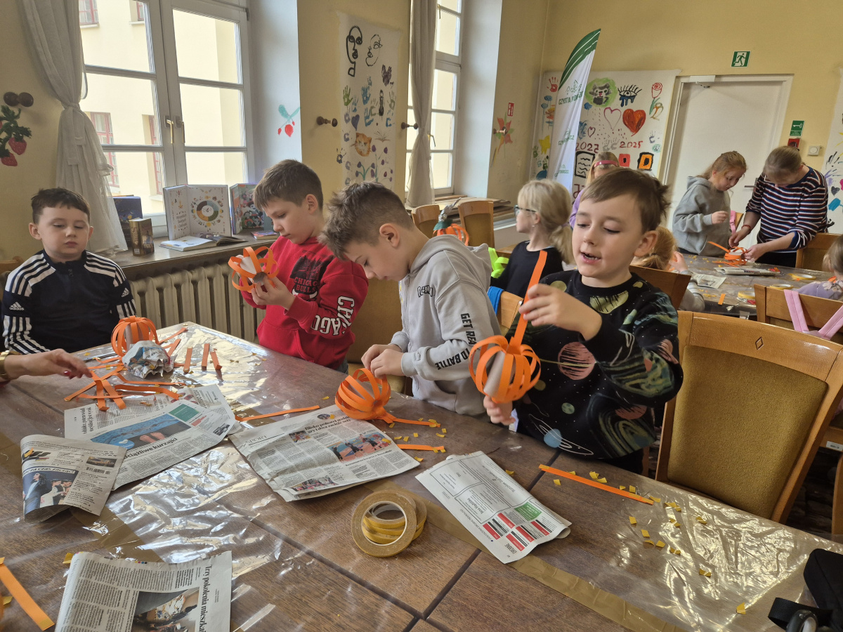 Po części teoretycznej przyszedł czas na twórcze działanie! Dzieci wykonały własne dynie z papieru i materiału, wykorzystując elementy recyklingu. Pomysłowość i kreatywność uczniów jak zawsze nie zawiodła — powstały wyjątkowe, kolorowe prace.