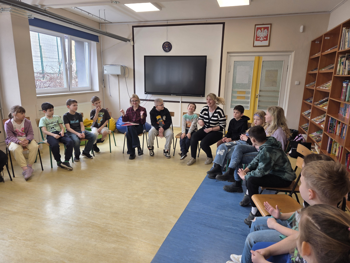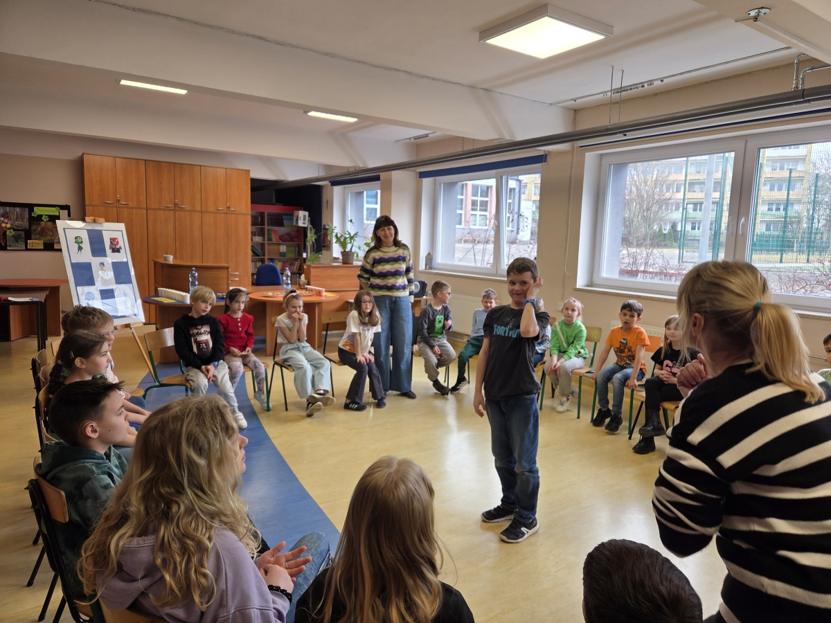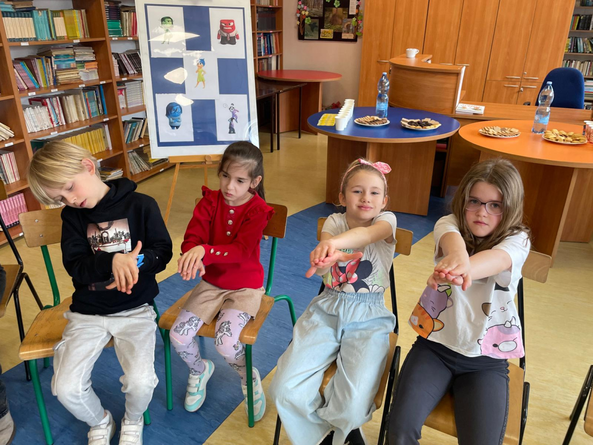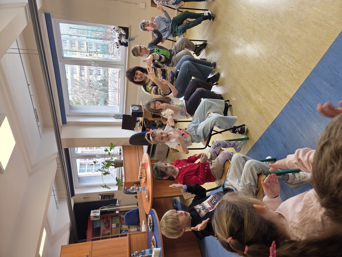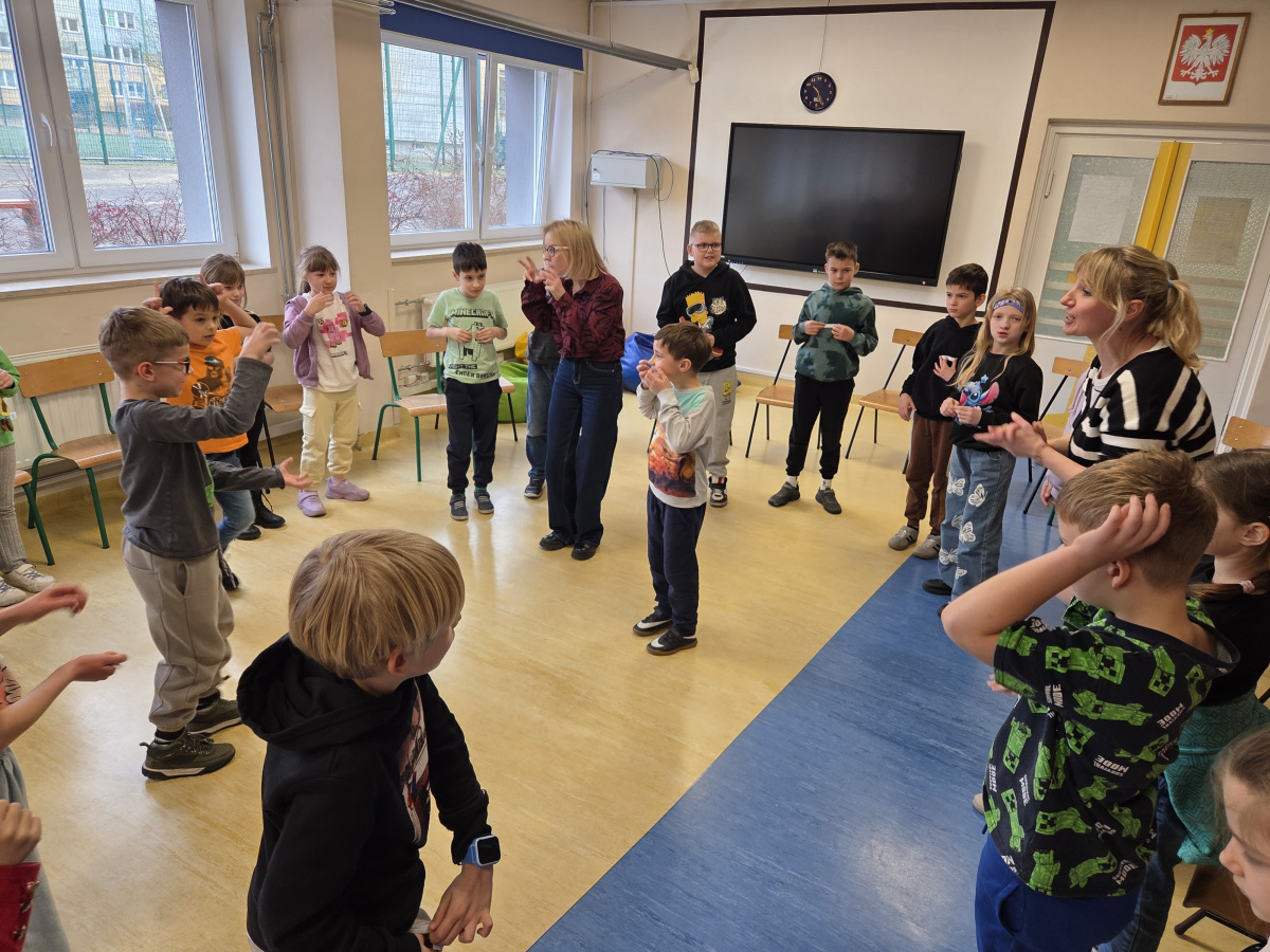W marcu uczniowie klasy 1a w ramach projektu „eMOCje w empatii” gościli w naszej szkole Agatę, Wiktorię, Aleksa, Filipa i Marcela z nauczycielami panią Karoliną i panią Agnieszką z Ośrodka Szkolno-Wychowawczego nr 2 w Bydgoszczy dla dzieci i młodzieży słabo słyszącej i niesłyszącej. Tematem spotkania było funkcjonowanie uczniów na co dzień oraz poznanie podstawowych sposobów komunikowania się z innymi. Podczas zajęć uczniowie poznali podstawowe zwroty grzecznościowe, oczywiście w języku migowym. Dowiedzieli się, jak bez użycia słów przekazać proste informacje. Pierwszakom najbardziej spodobała się zabawa podczas, której nauczyli się migać nazw kilku zwierząt: kot, pies, mysz, żółw, kura, krowa, owca, słoń, żaba, nosorożec. Takie spotkanie to fantastyczna lekcja do uwrażliwienia uczniów na inność i wzmocnienie tolerancji. Bardzo dziękujemy za taką wartościową lekcję!