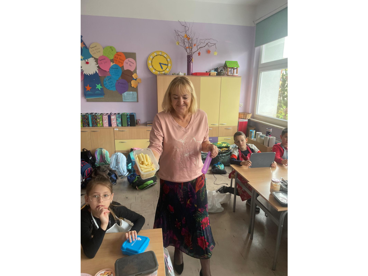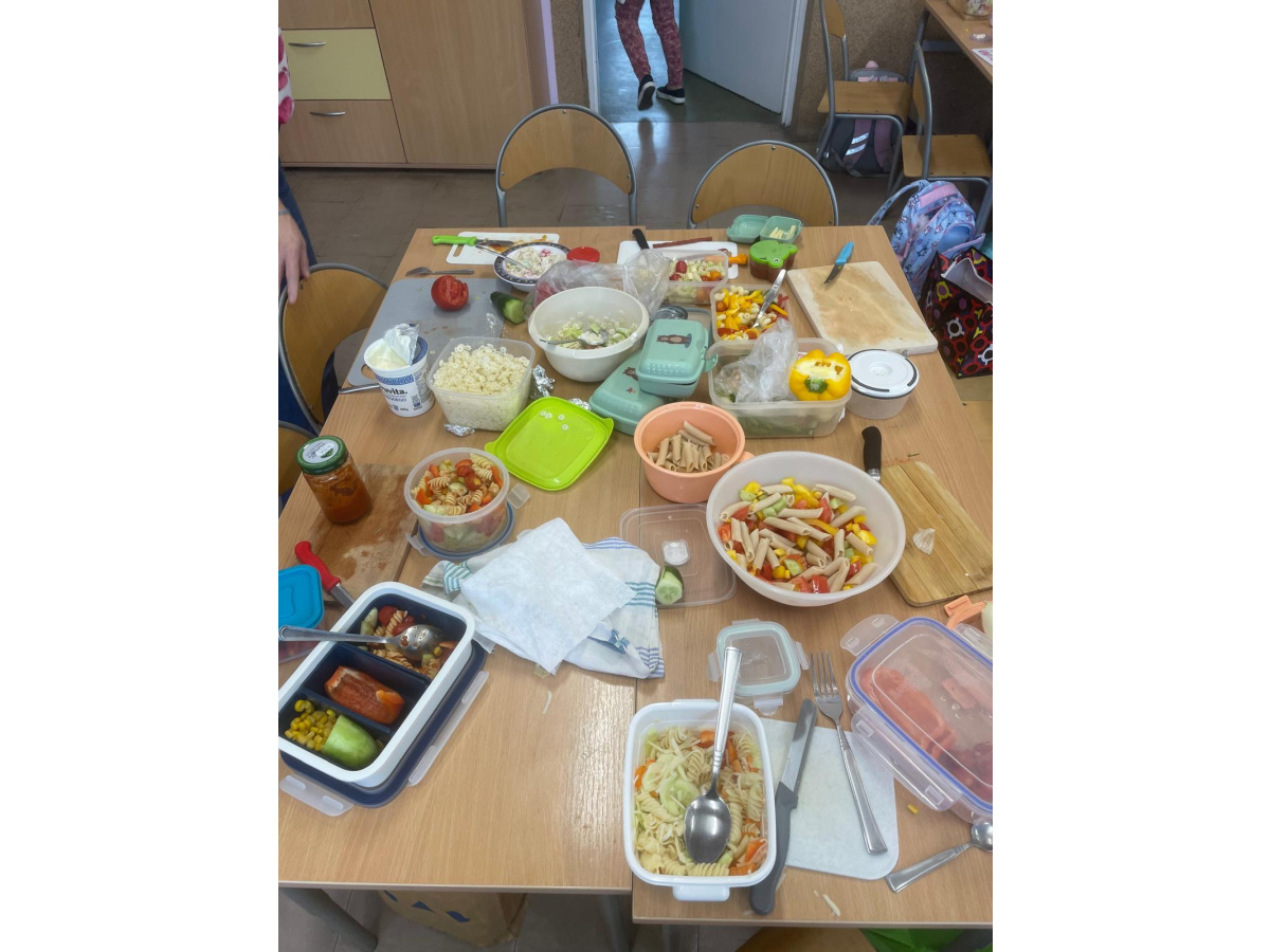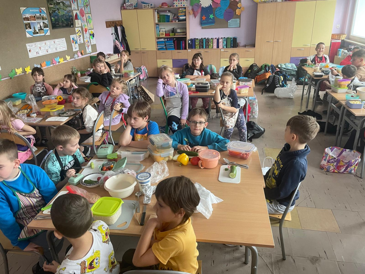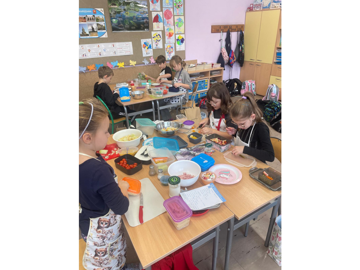 W piątek 24 października w szkole zorganizowaliśmy jesienny dzień dla zdrowia, w tym samym dniu przypadał też Dzień Walki z Otyłością, który ma na celu podnoszenie świadomości społecznej na temat otyłości jako poważnego problemu zdrowotnego, jego przyczyn, skutków i metod profilaktyki. Tym zajęli się uczniowie klas IV –VIII. Natomiast na poziomie klas I –III rozmawialiśmy dlaczego należy spożywać owoce i warzywa ? Przypomnieliśmy sobie piramidę zdrowia. Przerwy spędzaliśmy aktywnie, ćwicząc w rytm muzyki. Przygotowaliśmy sałatki makaronowe, w których ukryły się jesienne smaki. Wykorzystaliśmy do nich różnego rodzaju makarony, sery, warzywa. Uczniowie zrobili prawdziwe wariacje makaronowe. Wszystkie dania były smaczne, zdrowe i kolorowe. Bardzo nam smakowały. Wykorzystaliśmy też makaron do zrobienia korali. Dzień dostarczył nam wiele pozytywnych wrażeń.