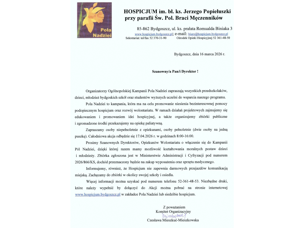 W najbliższy piątek 17.04 nasza szkoła weźmie udział w Ogólnopolskiej Akcji Pola Nadziei. Wolontariusze będą kwestować na rzecz bydgoskiego hospicjum. Dochód ze zbiórki będzie przeznaczony na zakup wyposażenia oraz sprzetu medycznego.