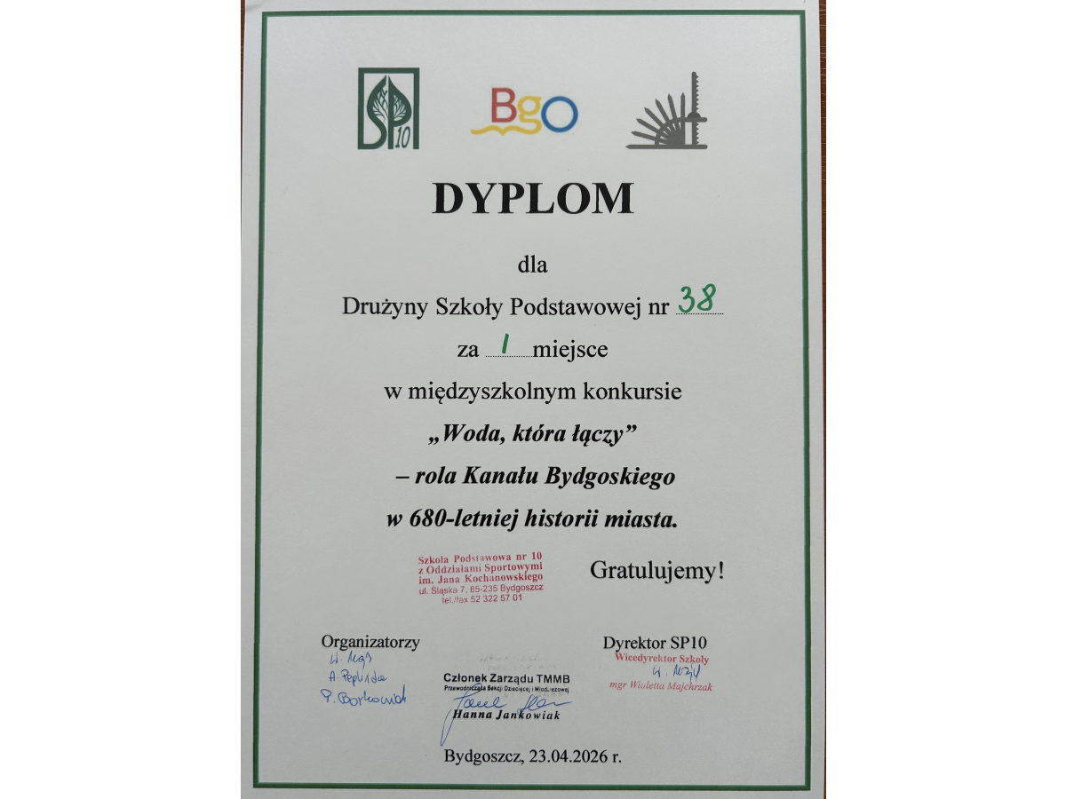 I miejsce w międzyszkolnym konkursie o Kanale Bydgoskim zdobyli jako zespół reprezentujący SP 38 w Bydgoszczy Bartosz Grzebyta i Artur Jóźwiak.