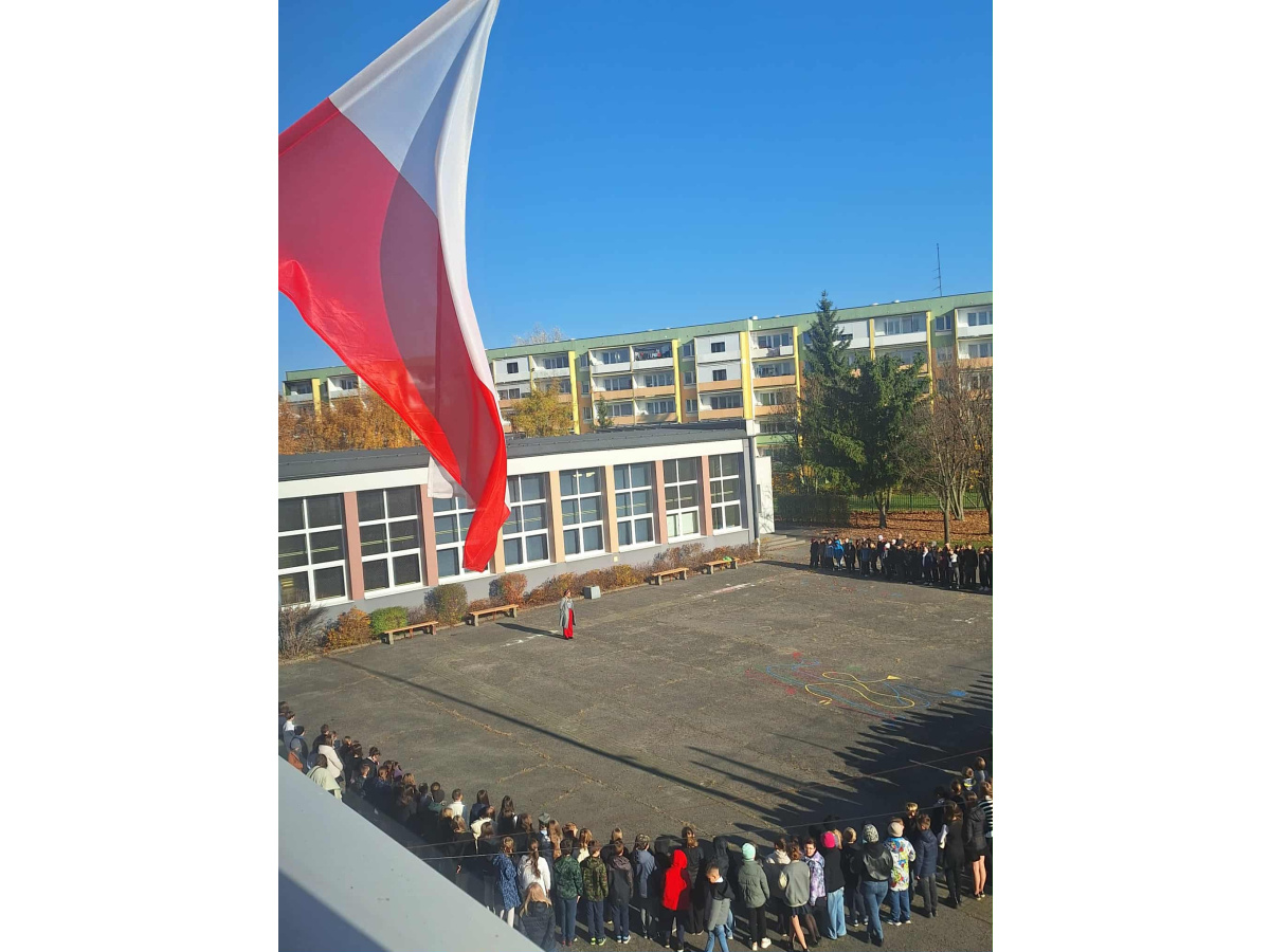 Uczniowie, ubrani w stroje apelowe, wspólnie odśpiewali na szkolnym boisku hymn Polski – „Mazurek Dąbrowskiego”. Swoją postawą pokazali szacunek, oddanie i miłość do Ojczyzny, dając wyraz patriotyzmu i jedności całej szkolnej społeczności.