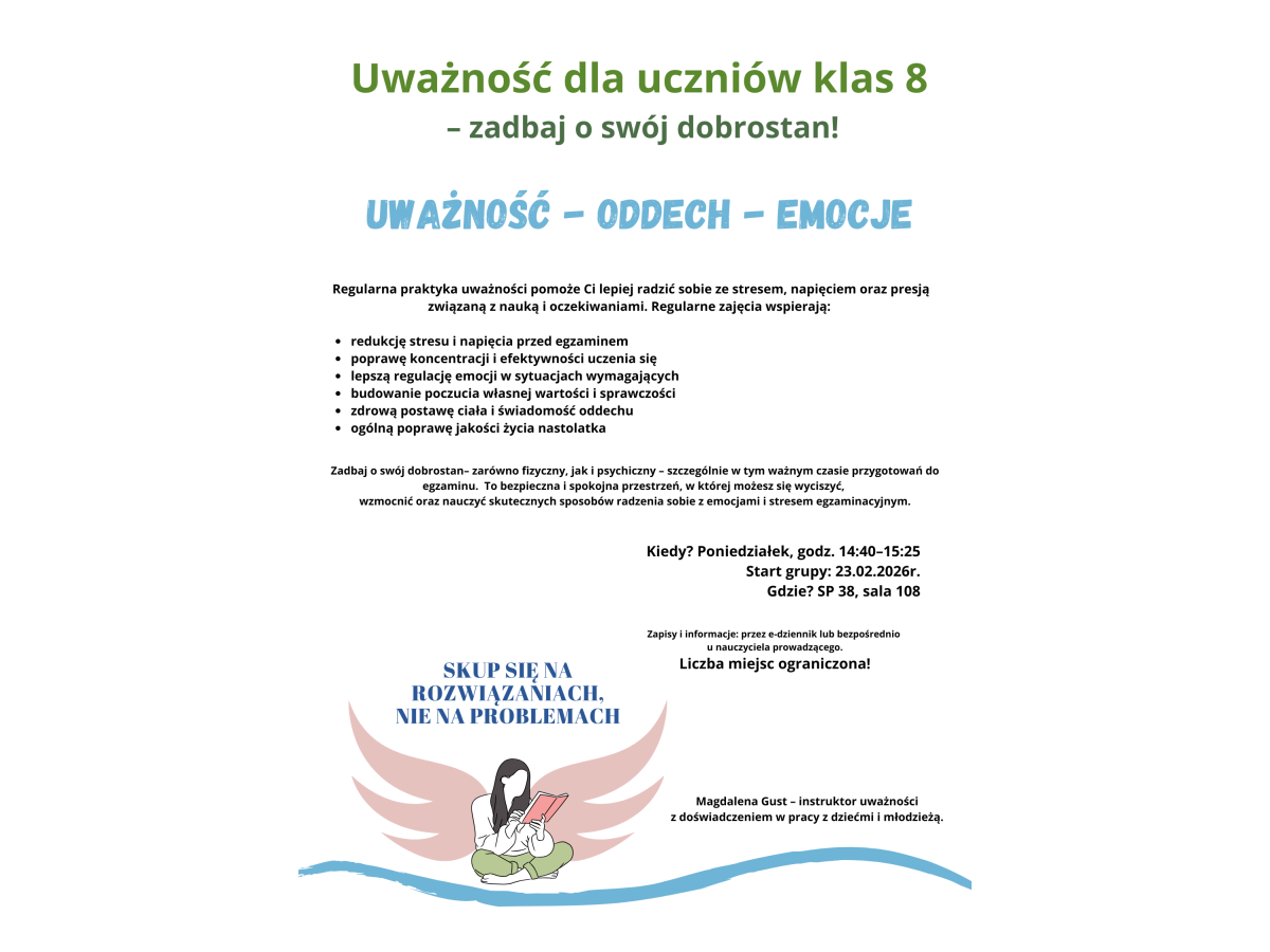 erdecznie zapraszamy uczniów klas ósmych na zajęcia uważności prowadzone przez Magdalenę Gust – instruktora uważności z doświadczeniem w pracy z młodzieżą.