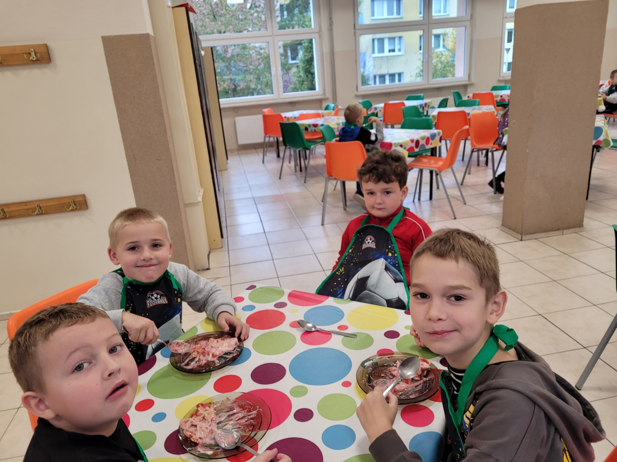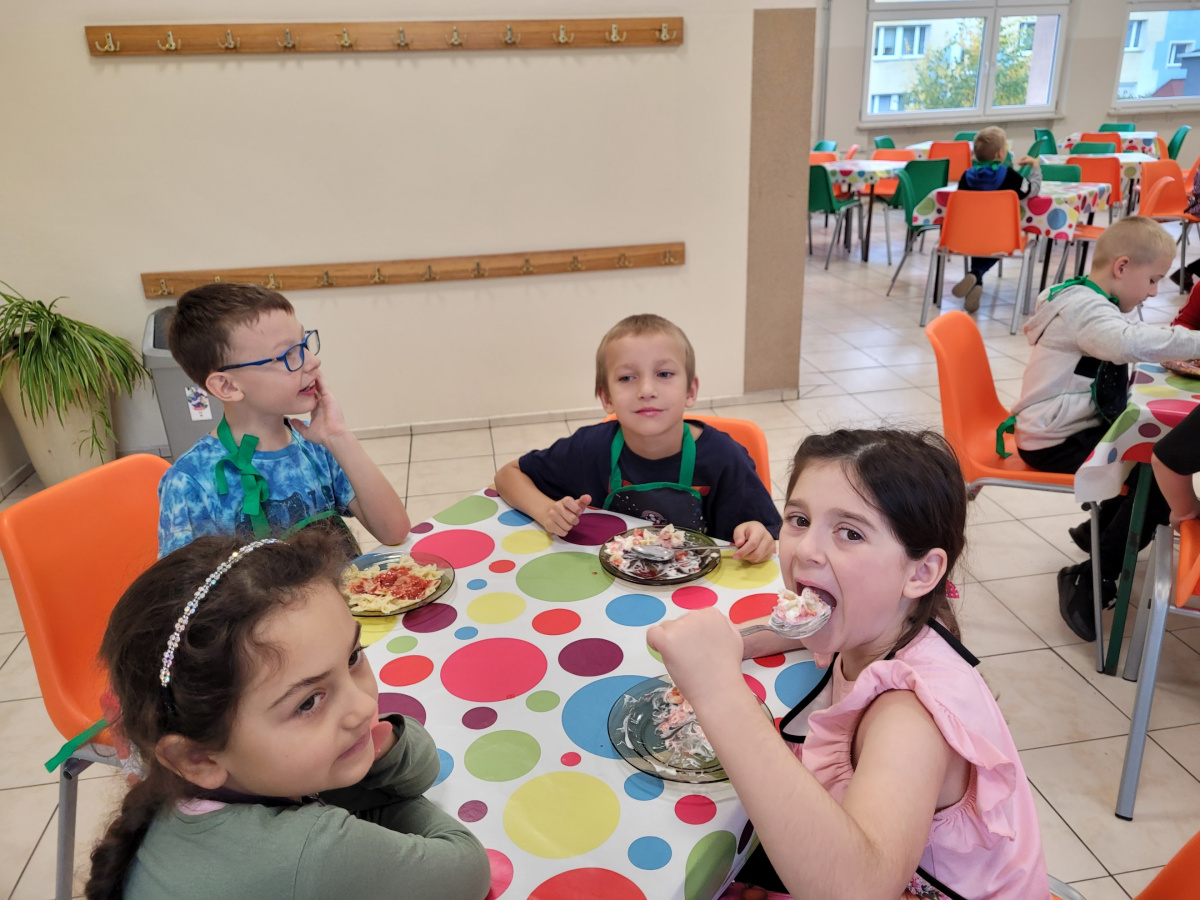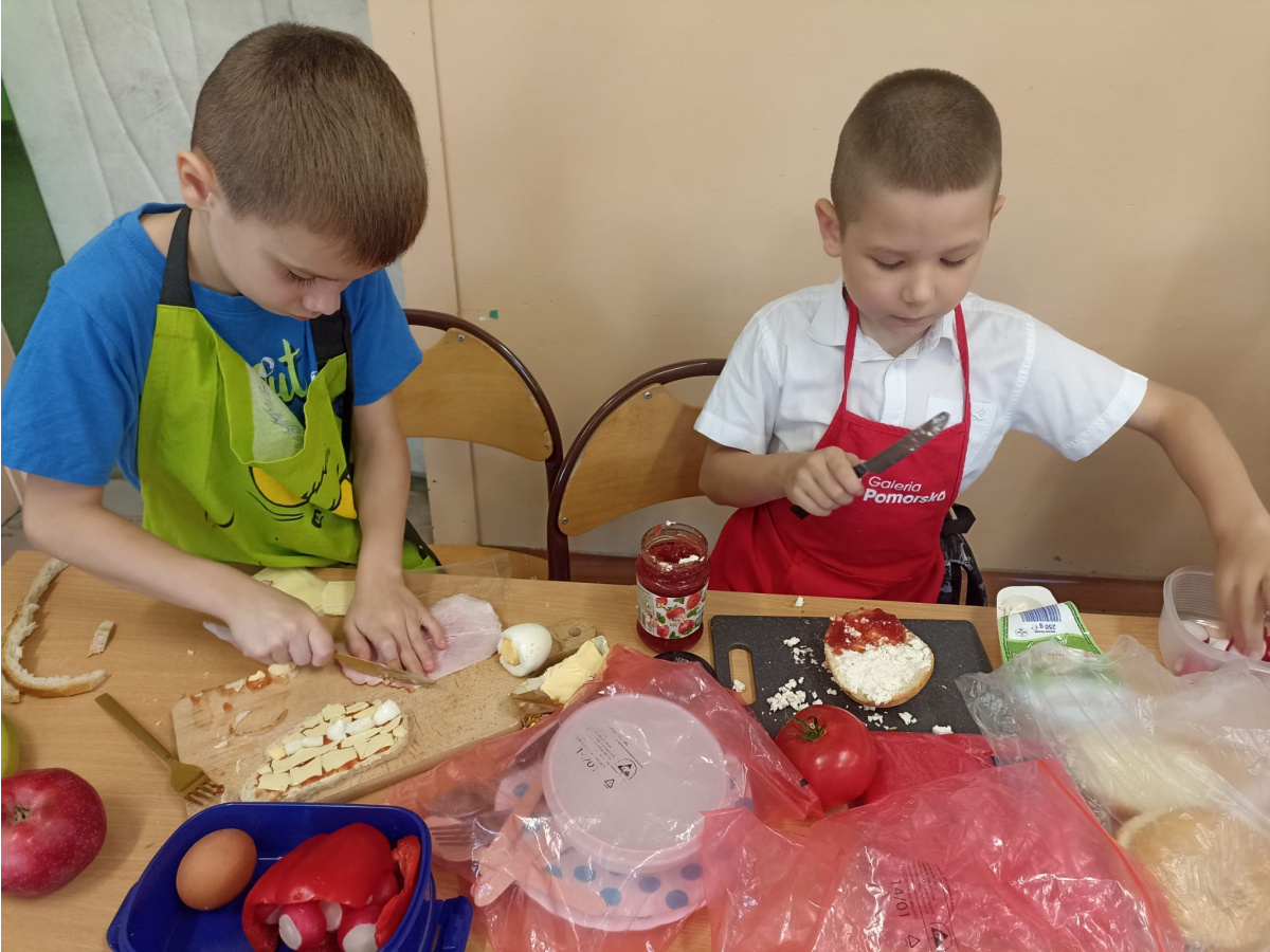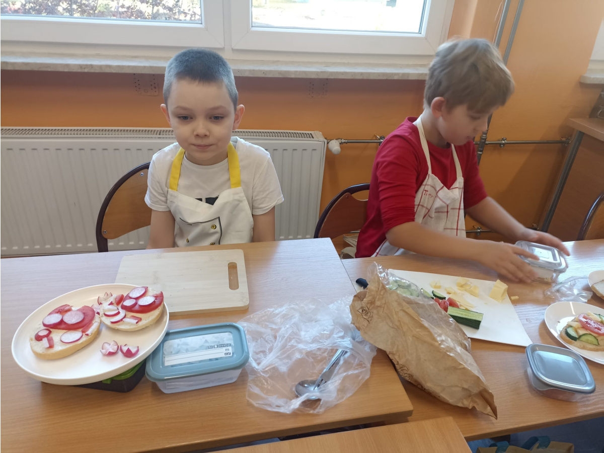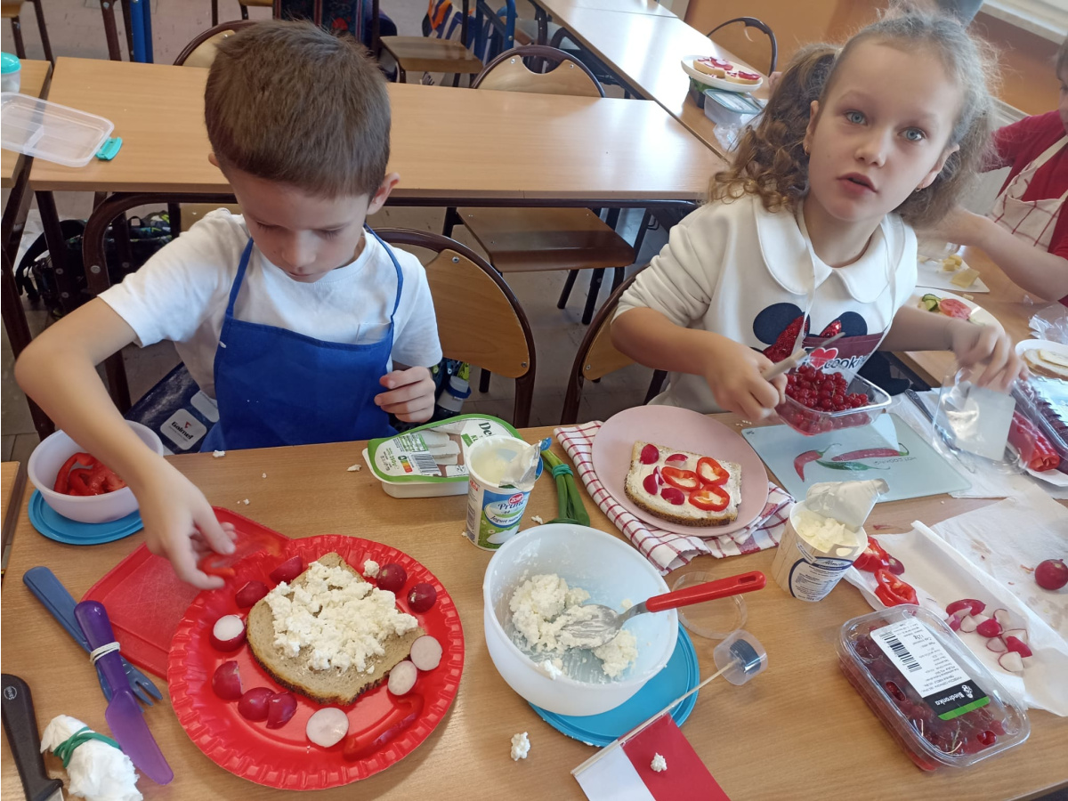 W ramach akcji „BEZPIECZNY BYDGOSZCZANIN TO JA!” uczniowie klasy I c i II b uczestniczyli w tym roku w różnych działaniach mających na celu promowanie zasad zdrowego odżywiania. Zasady zdrowego odżywiania są bowiem bardzo ważne dla dzieci – wpływają nie tylko na ich zdrowie fizyczne, ale również na rozwój mózgu, koncentrację, odporność i samopoczucie. Dzięki prelekcji na temat piramidy zdrowego odżywiania uczniowie dowiedzieli się, jak ważne dla ich zdrowia są regularne posiłki – 4–5 dziennie, bez długich przerw, duża ilość spożywanych codziennie warzyw i owoców – najlepiej do każdego posiłku, produkty pełnoziarniste zamiast wysoko przetworzonych, chude mięso, ryby, jajka, rośliny strączkowe, nabiał- jako źródło białka, orzechy, nasiona, oliwa, awokado, tłuste ryby- czyli zdrowe tłuszcze. Dzieci zrozumiały również dlaczego należy ograniczyć spożycie cukru, słodyczy, soli i fast foodów. Dowiedziały się także, że woda to najlepszy dla nich napój, a dzięki zdrowym posiłkom są spokojniejsze, mają więcej energii i rzadziej doświadczają wahań nastroju. Uczniowie samodzielnie przygotowywali także zdrowe, pełnowartościowe śniadanie w ramach akcji „Śniadanie daje moc” oraz „Śniadanie dla Niepodległej”, w barwach biało- czerwonych. Robiły również zdrowe przekąski: „Zbożowe ciasteczka dla nauczycieli” oraz „Makaronowe szaleństwo z truskawkowym musem”. Szczególnie w okresie zimowym pamiętajmy, że warzywa, owoce, probiotyki, pełnoziarniste produkty i zdrowe tłuszcze wspierają układ odpornościowy, zmniejszają podatność na infekcje, zmniejszają ryzyko otyłości, cukrzycy typu 2, nadciśnienia czy problemów z sercem w przyszłości.